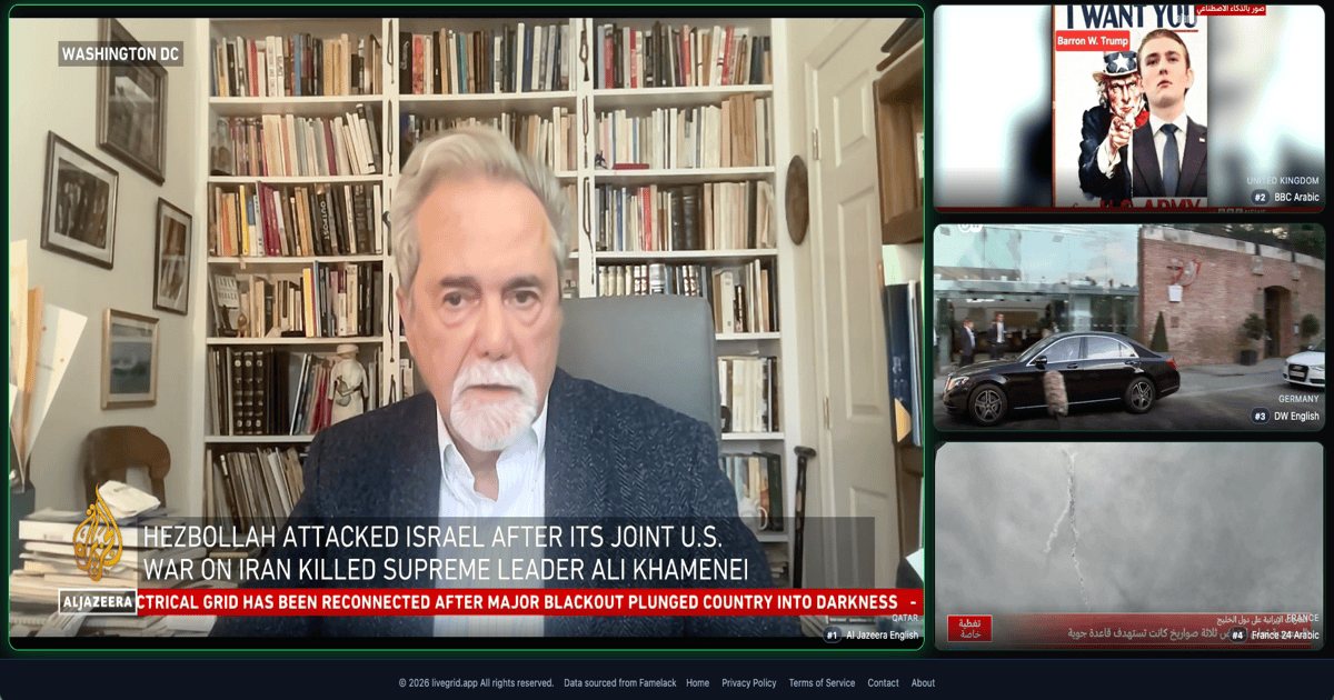 Hit "Watch Iran War News Now" to open LiveGrid with Al Jazeera English front and center, plus BBC Arabic, DW English, and France 24 alongside.