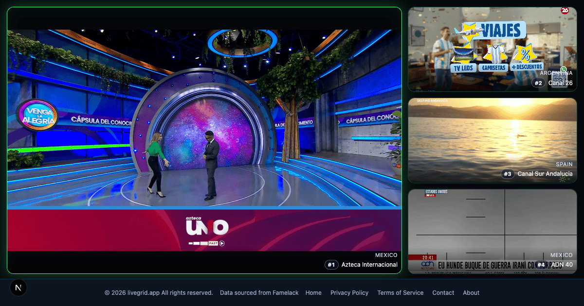 Instead of switching between multiple tabs or apps, watch all Latin TV live feeds on one screen. Monitor Azteca Internacional, Canal 26, Canal Sur Andalucia, and ADN 40 simultaneously. Our browser-based TV wall makes it easy to compare coverage and catch breaking news across major Latin American and Spanish broadcasters at once — no cable subscription needed.