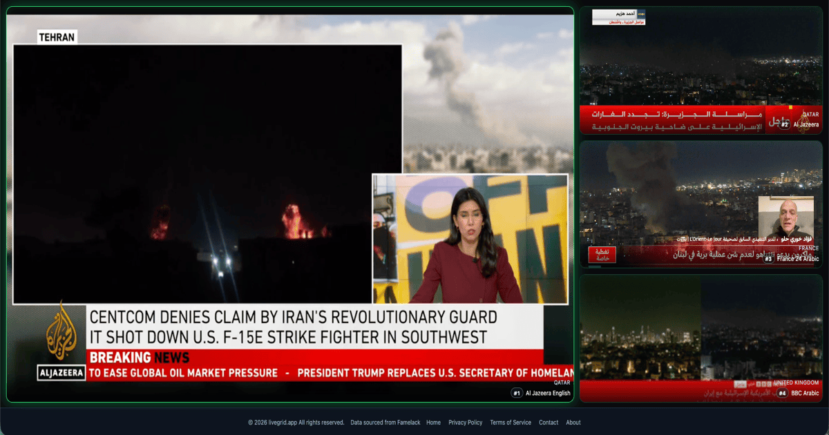 No login, no subscription, no installation required. Click the button and your Middle East news wall loads immediately in the browser — all 4 channels, ready to go. Perfect for journalists, analysts, and anyone monitoring the latest Middle East news, Iran war developments, and regional events in real-time.