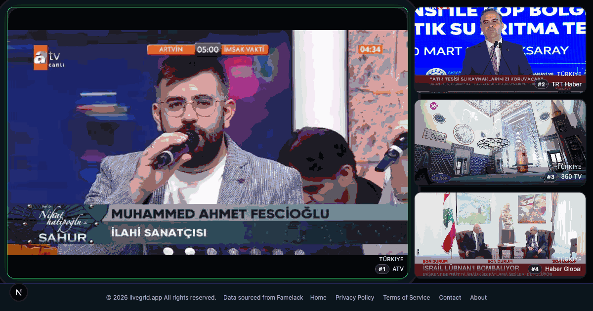 Watch 4 Turkish TV channels simultaneously — ATV, TRT Haber, 360 TV, and Haber Global streaming together on one screen. Turkish news and general entertainment from Turkey's top broadcasters. No login, no install. Explore 250+ Turkish channels in the LiveGrid catalog.